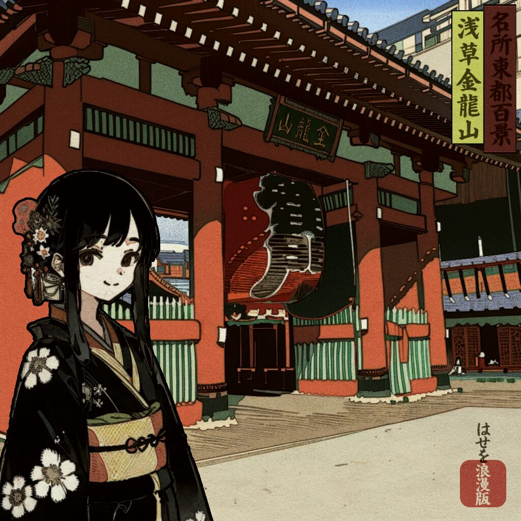 本作では、江戸の庶民文化を象徴する浅草寺を題材に、現地で撮影した写真をもとに Stable Diffusion と Photoshop を組み合わせ、雷門を中心とした景観を浮世絵風の構図として再構成しています。