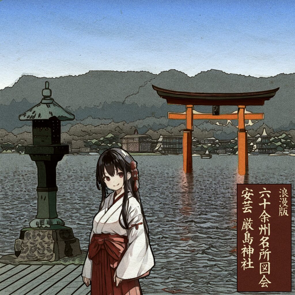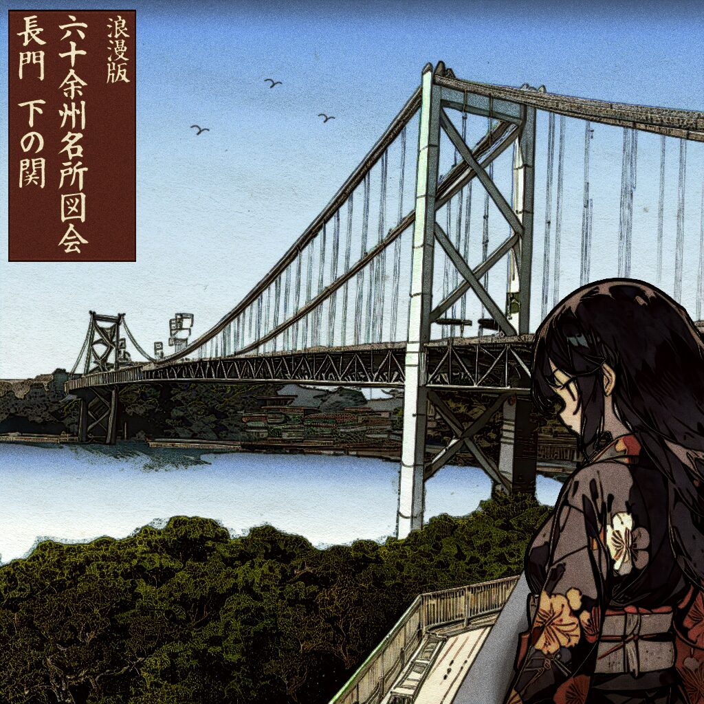 広重の名作『六十余州名所図会』に描かれた名所を、現地写真とAI・Photoshopで再構成したシリーズです。 各地の名勝をテーマに、浮世絵の雰囲気を活かしつつ、現代的な視点で情景を再解釈した作品群となっています。