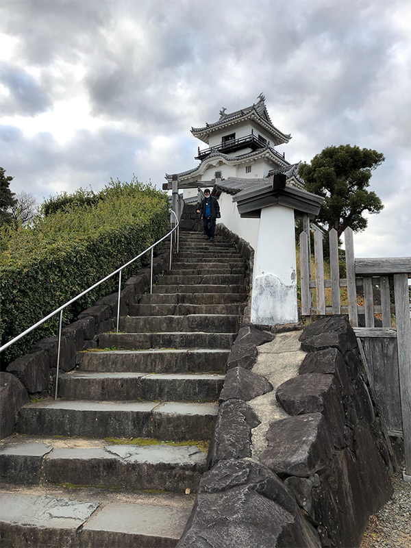 侍を思わせる装いの人物を配することで、天守へと続く石段に、往時の気配を静かに重ねています。