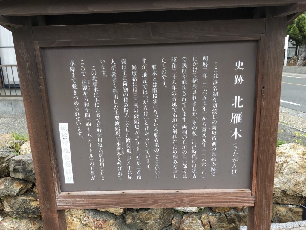雁木とは階段状になっている船着場のことをいいますが、地元では「がんげ」と昔からいっています。舞坂宿には三ヶ所の渡船場がありましたが、一番南側は主に荷物の積み降ろしをした渡船場、真ん中は旅人が利用した主要渡船場で本雁木と呼ばれていました。