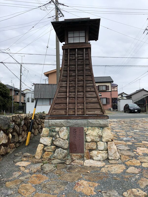 こちらは石畳の上に立つ常夜燈。台座に埋め込まれた石板には、「荒井宿に海上一里半 北雁木常夜燈」と記されています。石畳と並んで、この常夜燈も北雁木の史跡に江戸時代の雰囲気をそっと添えているようでした。