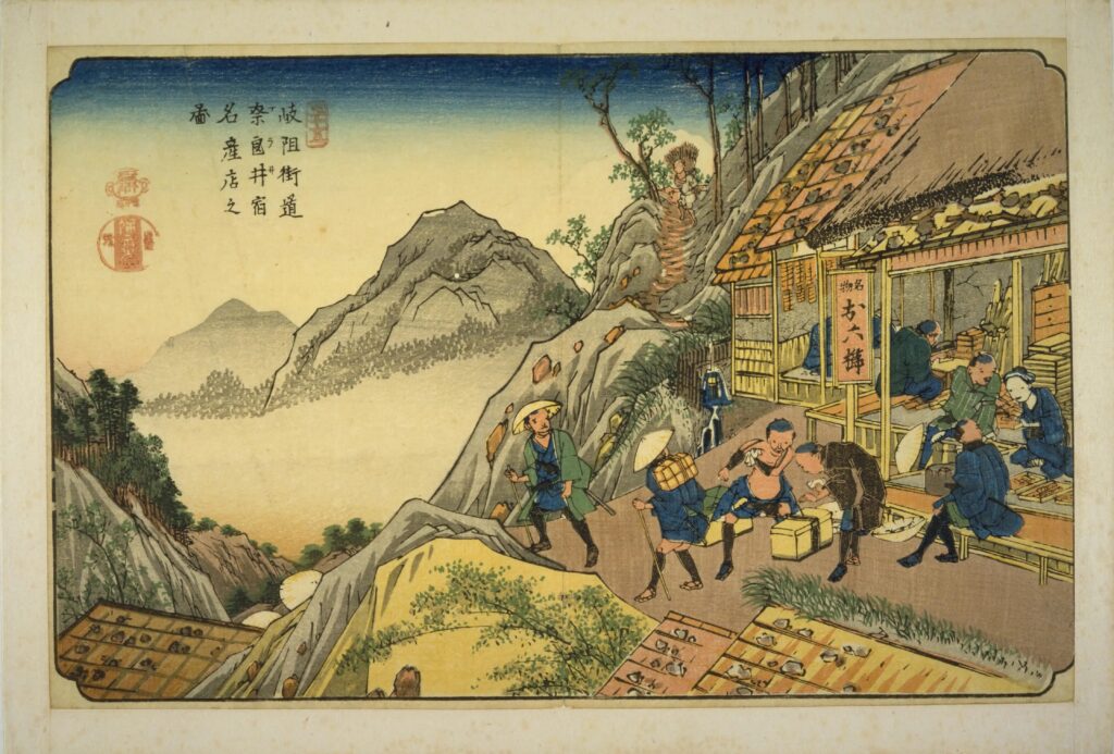 木曽の山々に抱かれた細長い街道沿いには、江戸時代の面影を色濃く残す町家が立ち並び、往時の暮らしを今に伝えています。歌川広重・渓斎英泉による 《木曽街道六十九次》 にも描かれ、その美しい町並みは、木曽路を象徴する景観として知られるようになりました。