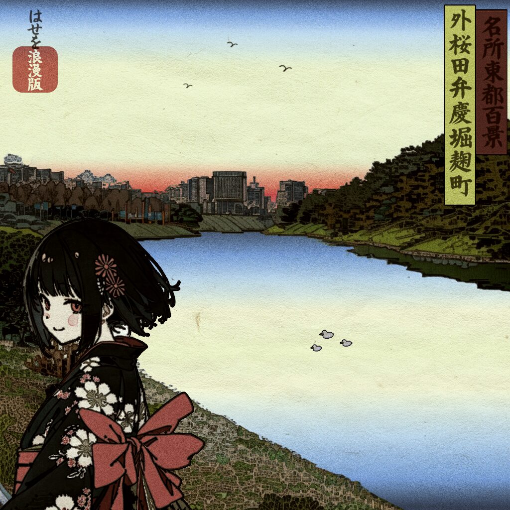 本作では、江戸城の面影を残す桜田堀を題材に、現地で撮影した写真をもとに Stable Diffusion と Photoshop を組み合わせ、広がりのある水辺と都市景観の対比を活かしながら、江戸の情緒を現代の風景の中に重ねる形で再構成しています。
