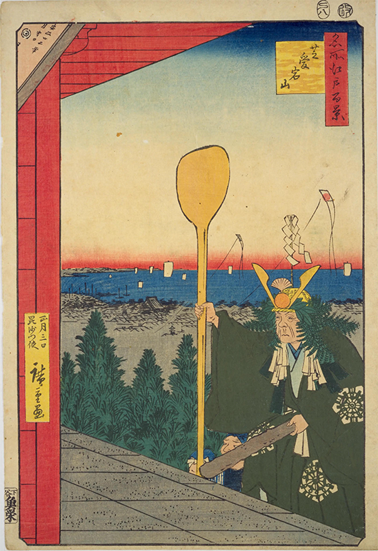 題材は歌川広重の《名所江戸百景》にも描かれた芝愛宕山にある愛宕神社・出世の階段。