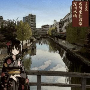 本作は、現地写真をもとに Stable Diffusion と Photoshop を組み合わせ、浮世絵風の構図と現代キャラ表現を融合して制作しています。