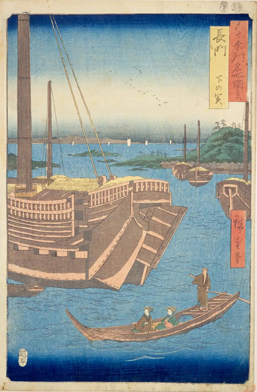 題材は歌川広重の《六十余州名所図会》にも描かれた長門・下の関。
