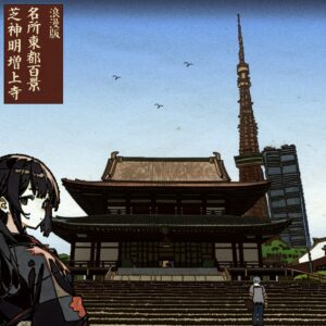 本作は、現地写真をもとに Stable Diffusion と Photoshop を組み合わせ、浮世絵風の構図と現代キャラ表現を融合して制作しています。
