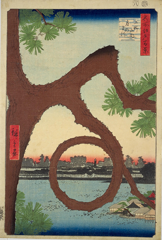 題材は歌川広重の《名所東都百景》に描かれた清水観音堂・月の松。