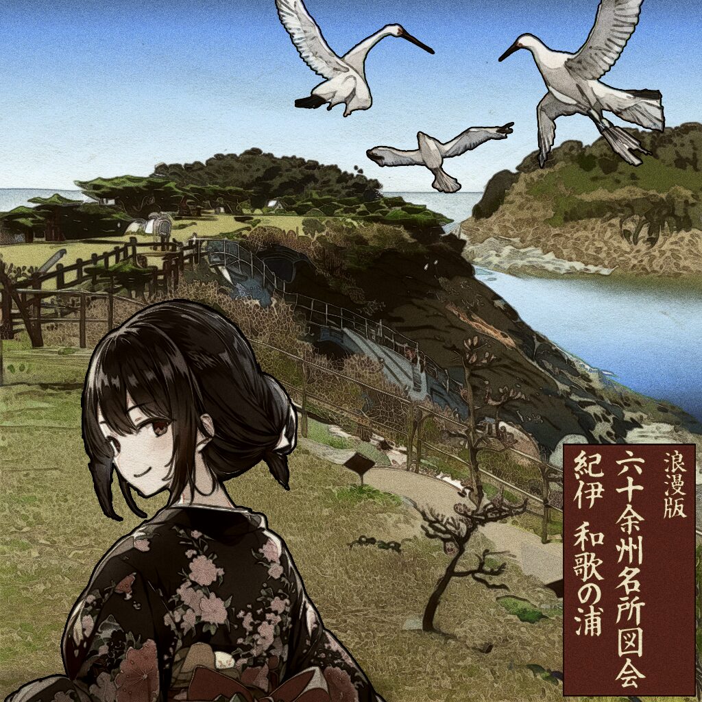 本作では、こうした和歌の浦の成り立ちと、万葉以来受け継がれてきた文学的情景をふまえ、現地写真をもとに AI 技術と Photoshop を組み合わせて再構成しています。